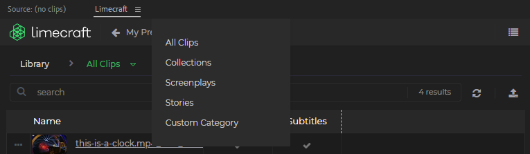 On the panel, you have the option to organise files into collections. Clicking on "All Clips" opens a dropdown menu displaying all the available categories.